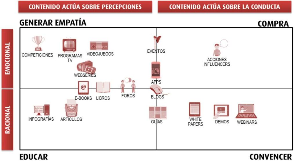 En Branded Content nadie parece haberse preocupado por desarrollar una metodología que nos facilite la tarea de decidir qué formato de contenido es el más adecuado en cada momento. Como todo es o todo parece ser contenido, bajo un paraguas tan inmenso pueden caer formatos tan diferentes en su concepción, producción y distribución como blogs, publicaciones físicas o digitales de cualquier tipo, eventos, conciertos, películas, obras de teatro, programas de TV o webseries, videjuegos, apps… y nadie parece saber lo que conviene producir.