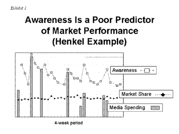 M H Blair afirma que no lo es. Una cosa es llamar la atención por medio de un anuncio efectista y otra muy distinta convertir este impacto en ventas contantes y sonantes. El análisis de decenas de campañas de un anunciante como Henkel (gráfico adjunto) nos recuerda que la ciencia publicitaria jamás ha logrado probar la existencia de una correlación directa entre las variables “notoriedad” y “participación de mercado” .